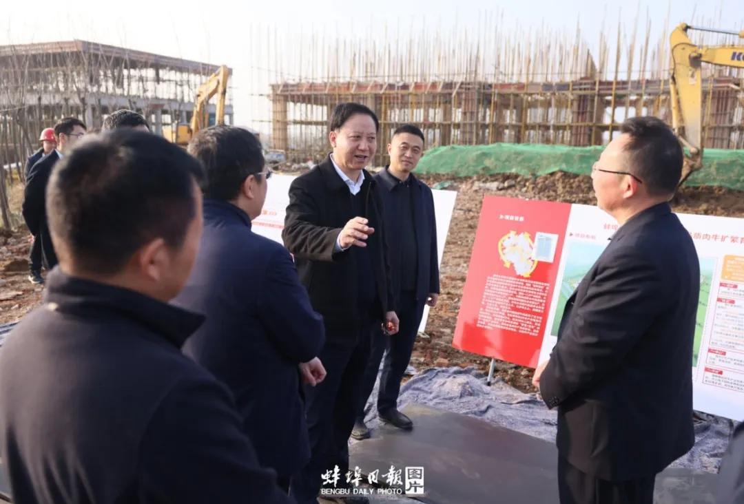 黃曉武書記現(xiàn)場察看施工進度,詳細了解項目進度、規(guī)劃設(shè)計等情況,陳建功董事長對項目建設(shè)和后期運營有關(guān)問題進行詳細介紹。黃書記對該項目建設(shè)表示充分肯定,強調(diào)要進一步加快建設(shè)進度,優(yōu)化運營模式,積極探索聯(lián)農(nóng)帶農(nóng)新模式,發(fā)展“智慧+生態(tài)”一體化肉牛養(yǎng)殖體系,要把鄉(xiāng)村產(chǎn)業(yè)發(fā)展擺在更加突出位置,下更大功夫抓好“糧頭食尾”“畜頭肉尾”“農(nóng)頭工尾”增值大文章,充分發(fā)揮蚌埠優(yōu)勢,深入實施“秸稈變?nèi)狻濒呷馀U衽d計劃,加強高品質(zhì)肉牛繁、育、加全產(chǎn)業(yè)鏈建設(shè),加快肉牛產(chǎn)業(yè)轉(zhuǎn)型升級,為鄉(xiāng)村振興提供有力產(chǎn)業(yè)支撐。